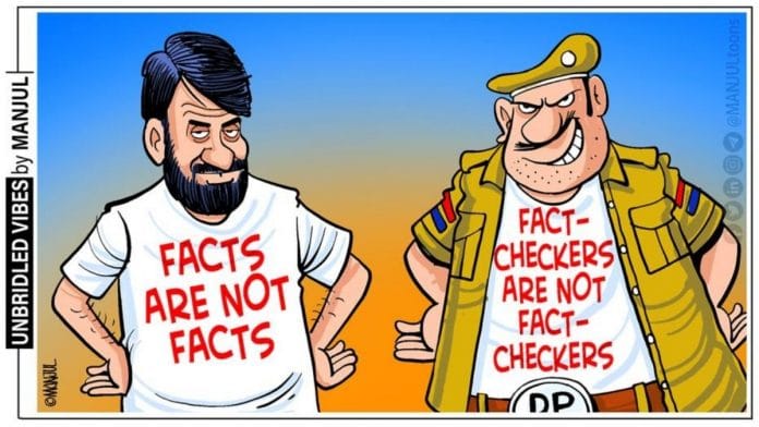 In today’s featured cartoon, Manjul, alluding to The Kashmir Files director Vivek Agnihotri’s “facts are not facts” comment in an interview with Newslaundry, takes a jibe at the case registered by Delhi Police against AltNews co-founder Mohammed Zubair over a tweet that allegedly hurt religious sentiments. A fact-checker, Zubair has since also been booked under the Foreign Contribution (Regulation) Act (FCRA), 2010, for allegedly receiving foreign donations, as well as Indian Penal Code sections on criminal conspiracy and evidence destruction.