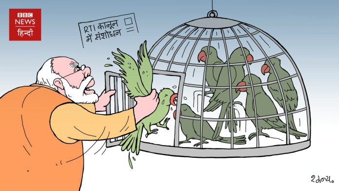 In today’s featured cartoon, Gopal Shoonya comments on the new amendments to the Right to Information (RTI) Act, 2005, passed by the Lok Sabha Monday, with an illustration of Prime Minister Narendra Modi’s move to ‘cage’ another parrot.