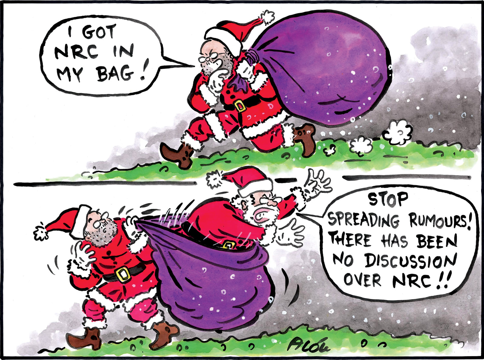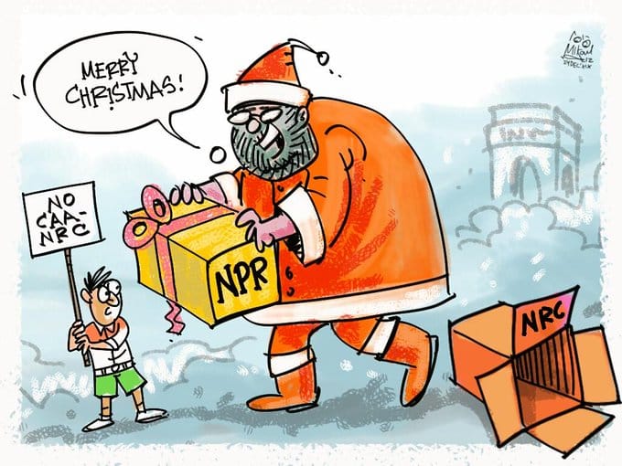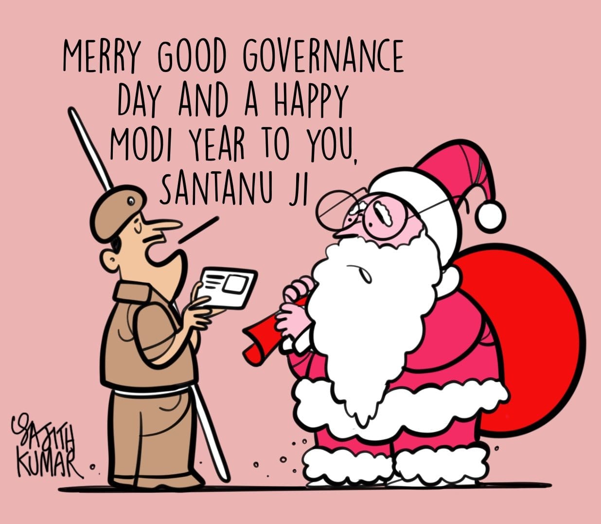 Sajith Kumar takes a shot at the Modi government’s prior decision to celebrate ‘Good Governance Day’ on former PM Atal Bihari Vajpayee’s birth anniversary, which falls on Christmas day, in the context of the Citizenship (Amendment) Act and the immigration issue, represented by Santa Claus.