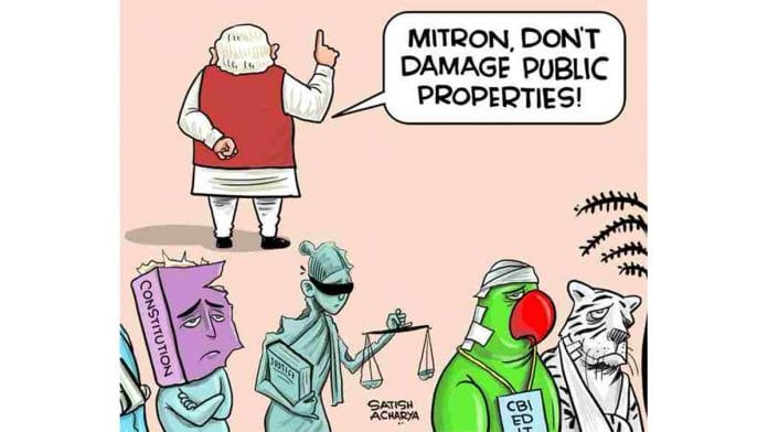 In today’s featured cartoon, Satish Acharya illustrates the flip side of PM Modi’s appeal to the protesters to not damage public properties.