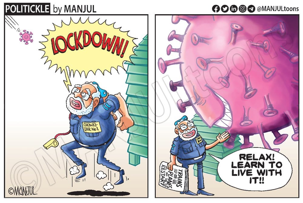 As India enters its first phase of unlocking, Mahamud pokes fun at the Narendra Modi government over its approach to revive the Indian economy after two months of nationwide lockdown; in today’s featured catoon.