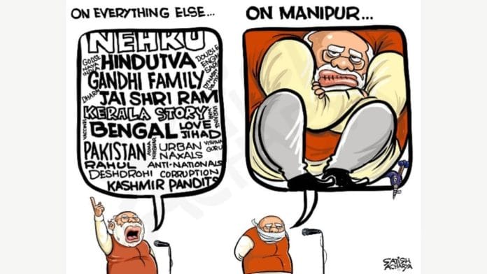 In today’s featured cartoon, Satish Acharya takes a dig at Prime Minister Narendra Modi’s silence on the ongoing violence in Manipur.