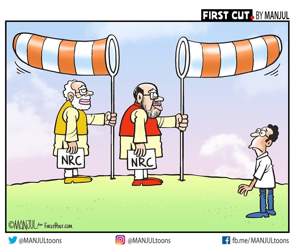 In light of the comments made by Prime Minister Modi at the rally in Delhi, Manjul satirises the contradictory position held by him and Home Minister Amit Shah on the nationwide National Register of Citizens.