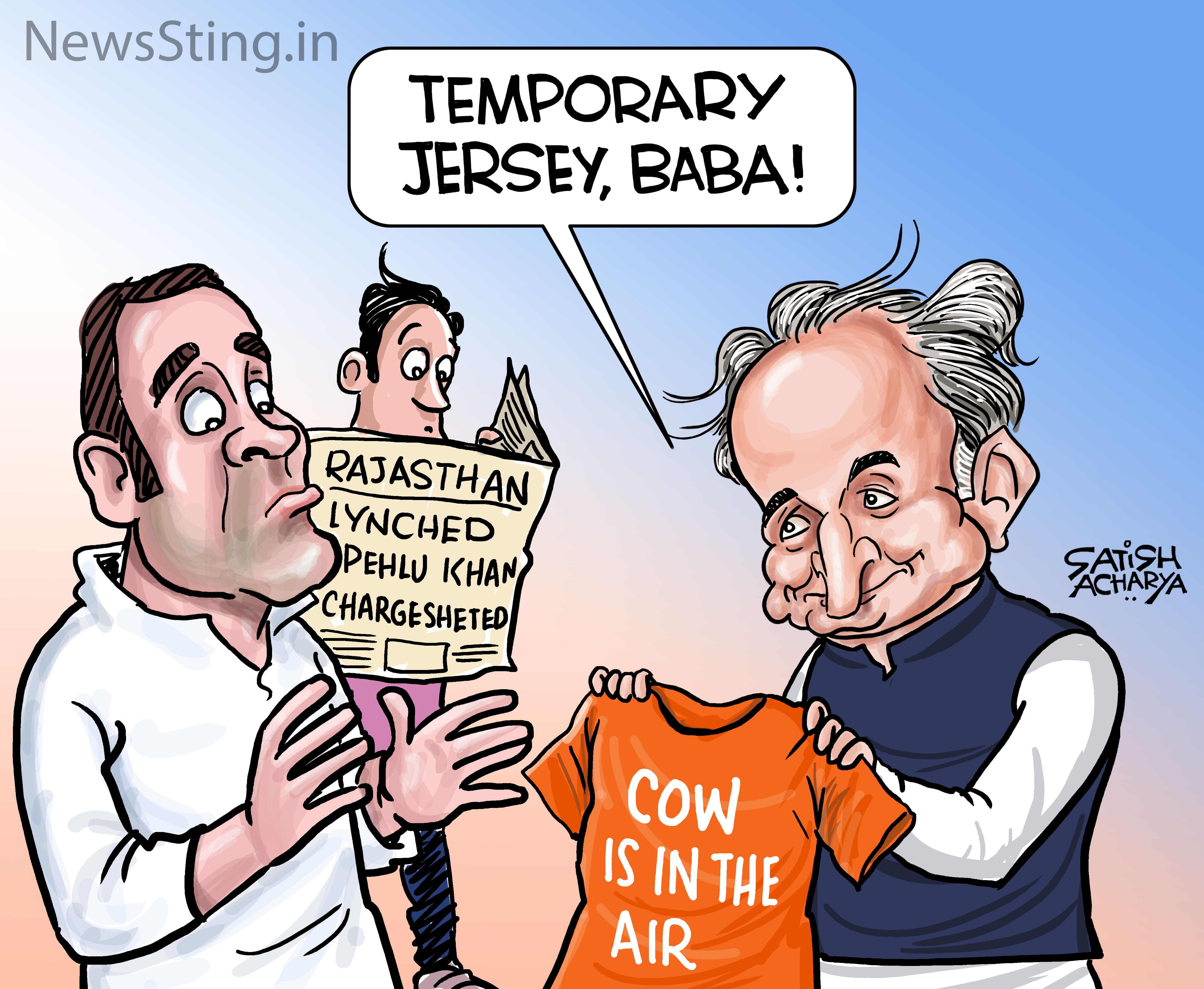 Satish Acharya takes a swipe at Rajasthan CM Ashok Gehlot and Congress president Rahul Gandhi after the state government chargesheeted 2017 Alwar mob lynching victim Pehlu Khan and his sons for illegal transport of cattle. The cartoonist builds the punch around the recent controversy over the alleged ‘saffronisation’ of the Indian cricket team jersey.