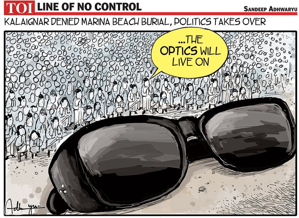 Cartoonist Sandeep Adhwaryu takes a dig at the controversy over DMK chief M. Karunanidhi’s burial. His son M.K. Stalin had requested the AIADMK-led Tamil Nadu government to allow the burial of the Kalaignar at Chennai’s Marina beach, next to his mentor Anna’s samadhi. However, the state government said no.