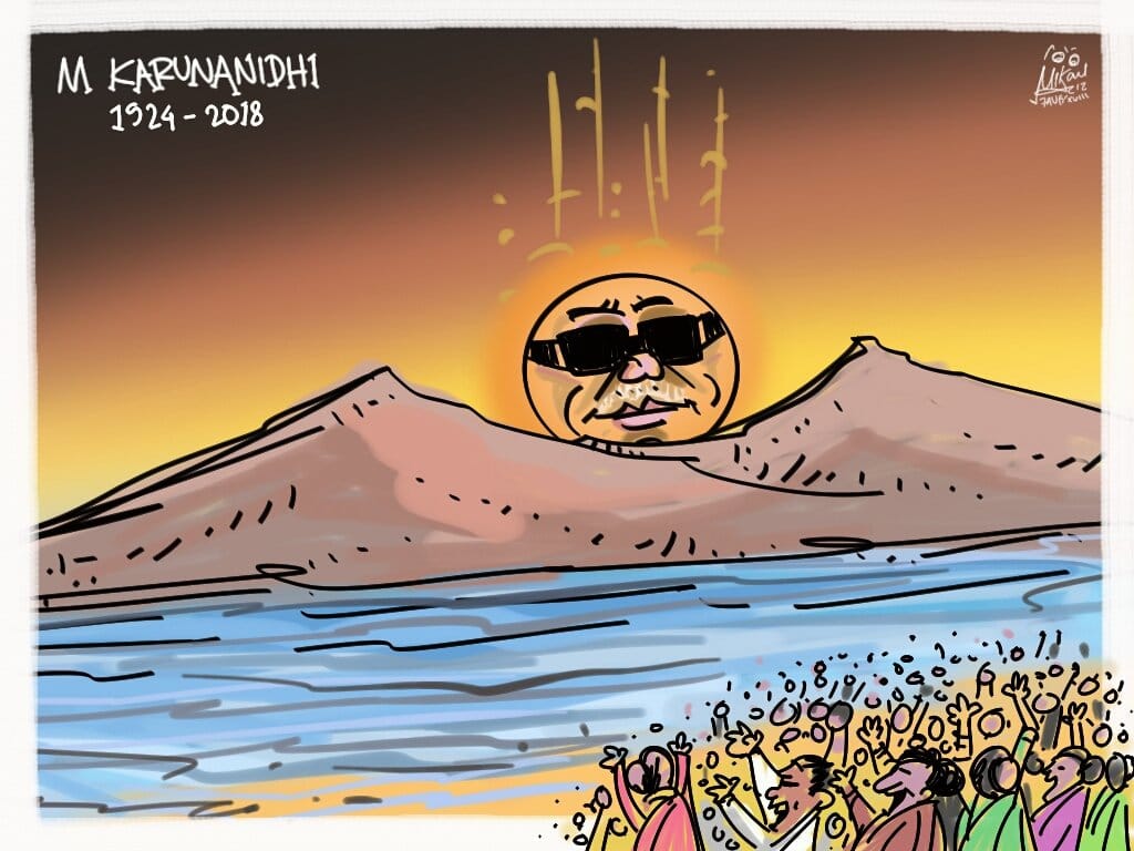 The death of Karunanidhi marks the end of an era in Tamul Nadu’s politics, as shown in Mika Aziz’s illustration.