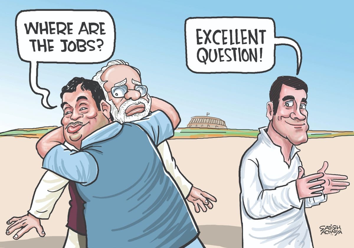 In response to union minister Nitin Gadkari’s concern over employment in India, Rahul Gandhi tweeted Monday “excellent question”. Satish Acharya has a witty take on it.