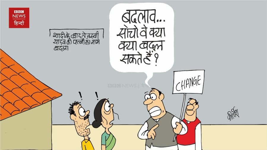 Kirtish Bhatt on Tejashwi Yadav introducing his newly wedded wife Rachel Godinho as “Rajshri” post-marriage, as he said said the moniker given by his father Lalu Prasad would be easier to pronounce. In the cartoon, a political leader convinces voters that if the RJD leader can get his wife’s name changed, imagine what else he can change.