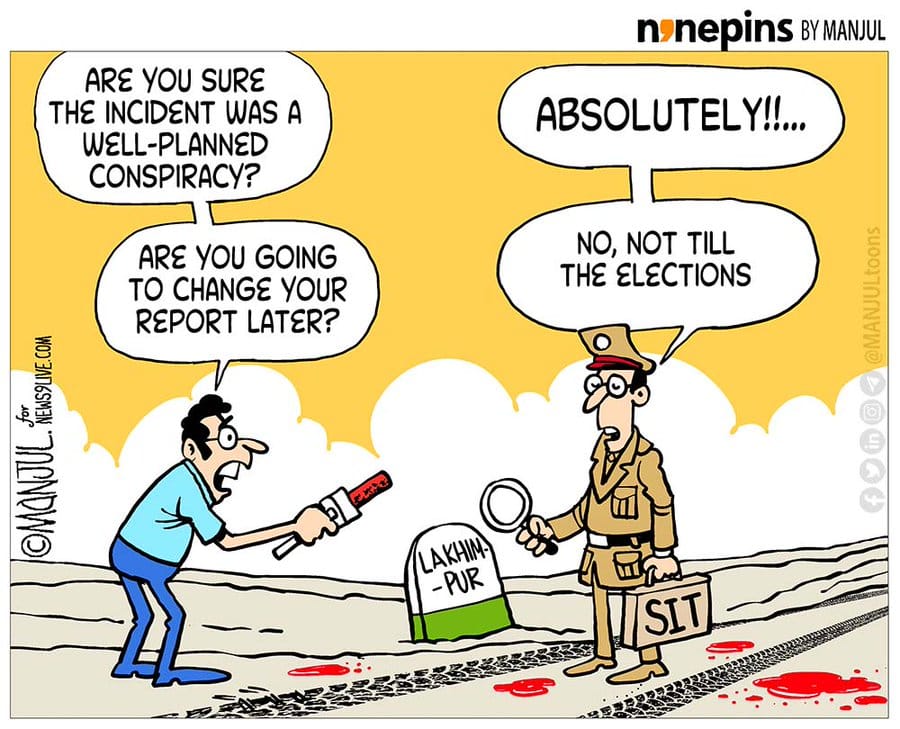 Manjul links the report of the Special Investigation Team (SIT) of the UP Police investigating the Lakhimpur Kheri case with the upcoming assembly elections in the state. The SIT has said the incident was a ‘well planned and deliberate act’, and not negligence or callousness.