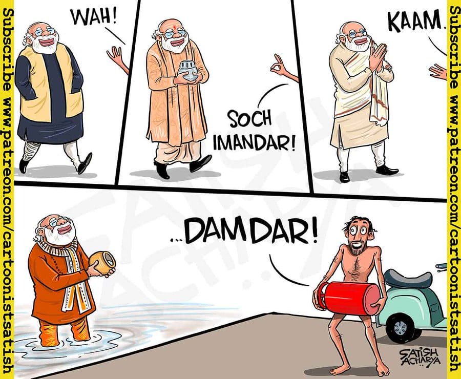 Satish Acharya illustrates the different activities the PM did on his Varanasi trip, and jokes that while Modi kept changing clothes, the common man has had to sell his clothes to buy expensive LPG cylinders.