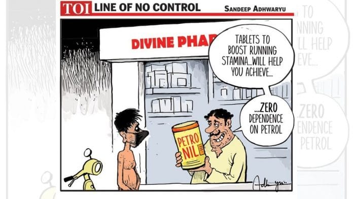 In today’s featured cartoon, Sandeep Adhwaryu takes a dig at India’s rising fuel prices, and the new controversy surrounding Coronil, Patanjali’s Covid ‘treatment’. Baba Ramdev Friday had falsely claimed that the Ayurveda tablet had received WHO approval.
