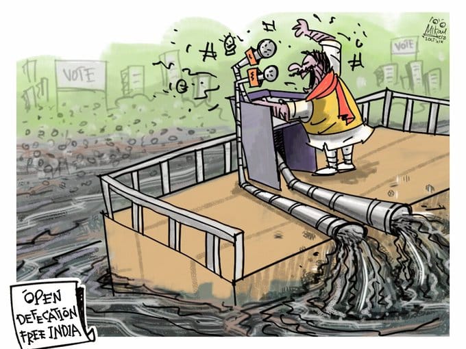 Prime Minister Narendra Modi may have declared rural India as open-defecation free but Mika Aziz’s cartoon shows that the reality might be slightly different.