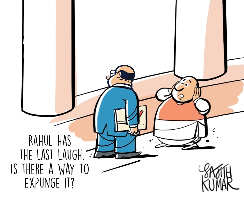 Sajith Kumar’s cartoon talks about the Supreme Court’s stay on Congress leader Rahul Gandhi’s conviction in a criminal defamation case which had resulted in his expulsion from Lok Sabha four months ago. The top court’s decision meant Gandhi’s membership would be restored.