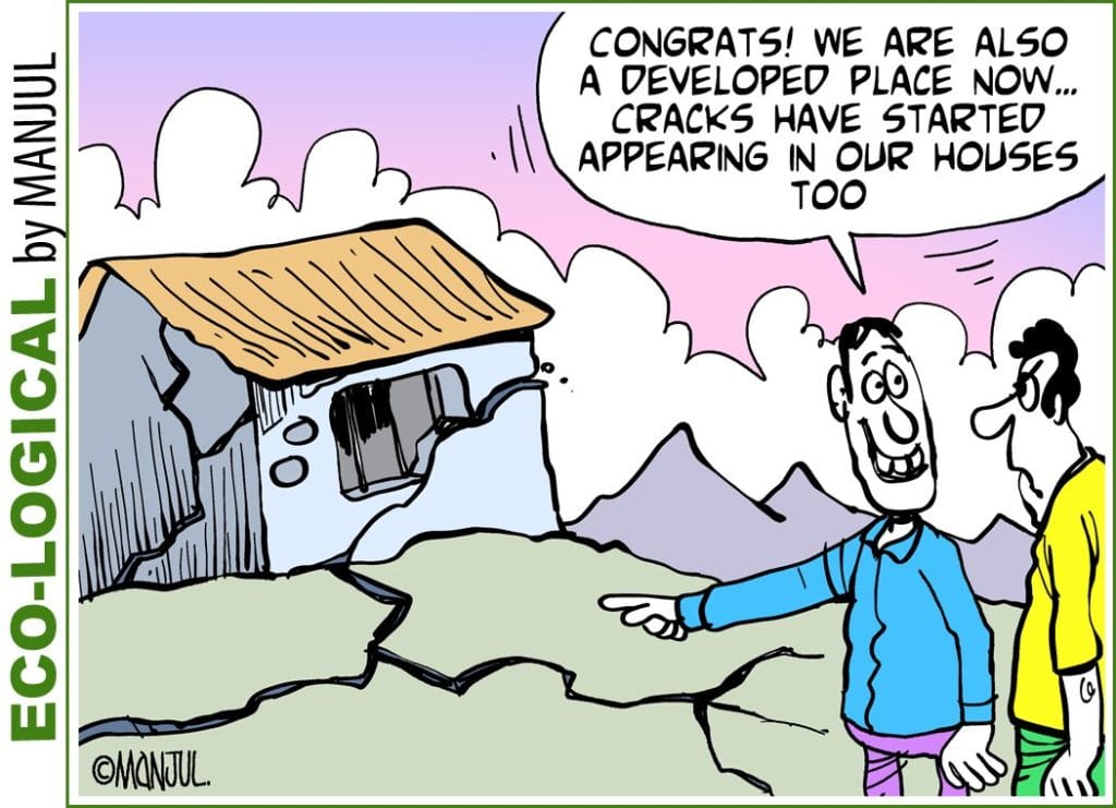 Cartoonist Manjul plays on the word “developed” as his protagonist points to cracked houses in Himachal Pradesh as a result of back-to-back construction projects, allegedly in the name of development.