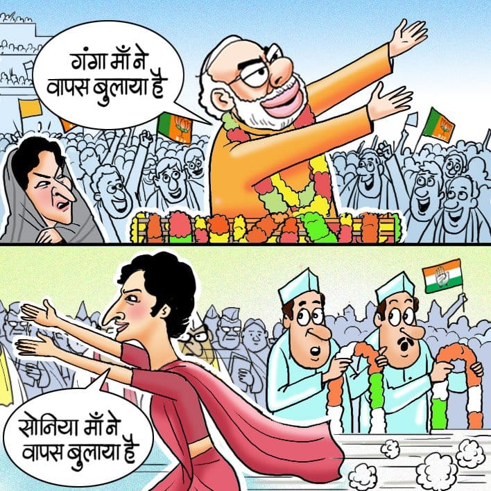 Neelabh Banerjee also takes a jibe at the Congress leader, depicts Priyanka Gandhi Vadra’s walk-out from Varanasi to answer her “mother’s call”. The cartoonist builds his punch over Prime Minister Narendra Modi’s remark that “mother Ganga” has summoned him to Varanasi.