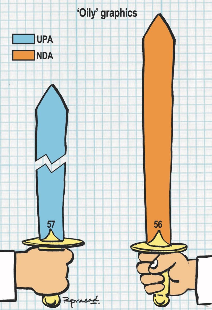 R. Prasad takes a jibe at the BJP’s muddled infographics regarding the oil price hike. He uses Narendra Modi’s old “56-inch chest” comment to depict the NDA’s sword, which is “bigger” than the UPA’s 57-inch but broken sword.