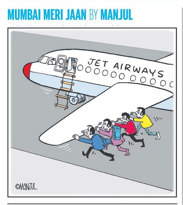 Manjul, for Mid-day, takes a dig at the plight of Jet Airways, which is likely to suspend its operations due to lack of funds.