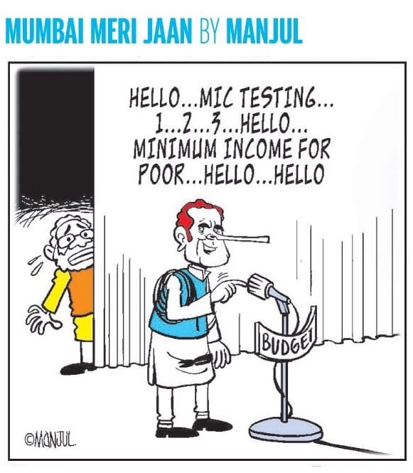 Manjul for Firstpost also features Gandhi’s minimum income promise. He depicts Gandhi fixing up the microphone before the Budget announcement to deliver his own sop, which is making Prime Minister Narendra Modi nervous.