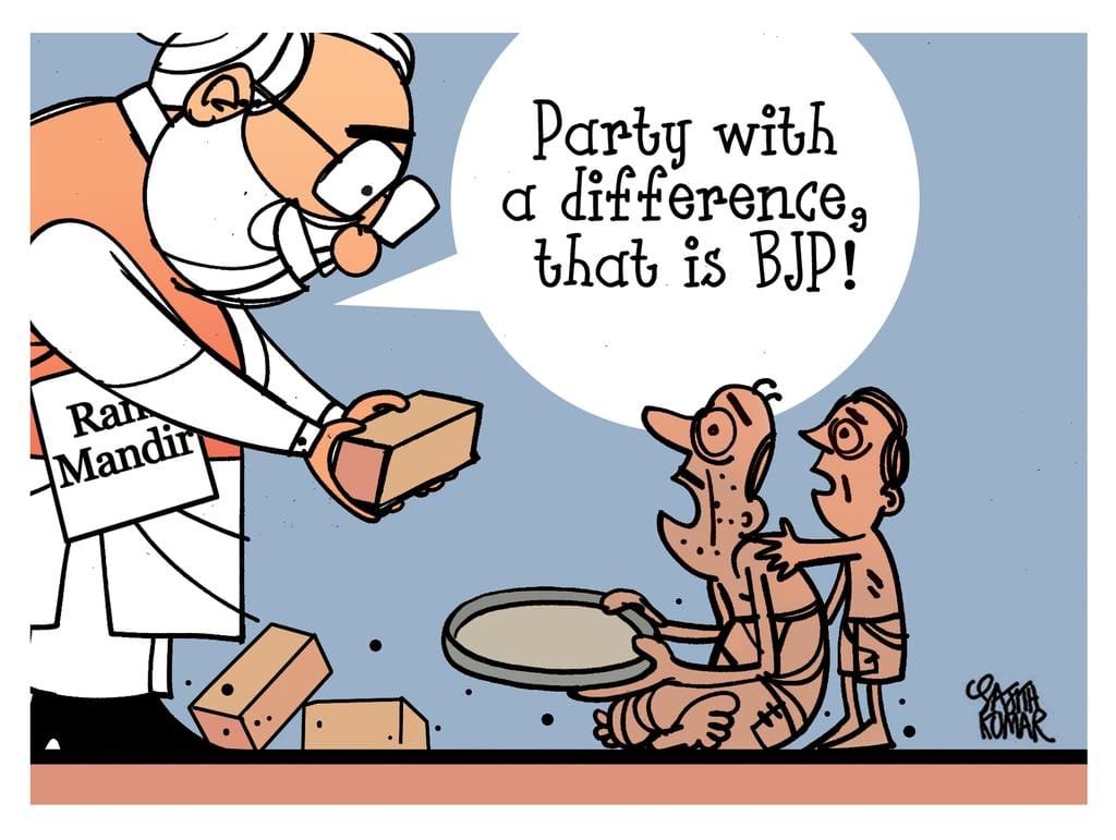 Sajith Kumar for Deccan Herald takes a jibe at Narendra Modi’s old claims that the BJP is a party with a difference. It shows PM Modi serving Ram Temple bricks to India’s starving poor.