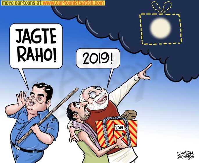 Satish Acharya spins road transport and highways minister Nitin Gadkari’s comments into a jibe at PM Modi. Gadkari had said the public thrashes those who don’t keep their promises, so Acharya depicts him raising a ‘stay awake’ cry like a security guard while Modi repackages his 2014 promises and promises the moon to the common Indian in 2019.