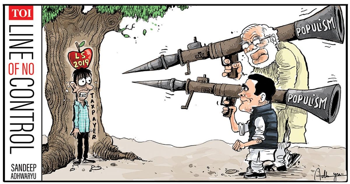 Sandeep Adhwaryu for The Times of India suggests that both PM Modi and Rahul Gandhi are using the big gun of populism to maximise their Lok Sabha returns, but eventually, the taxpayer is the one bearing the brunt.