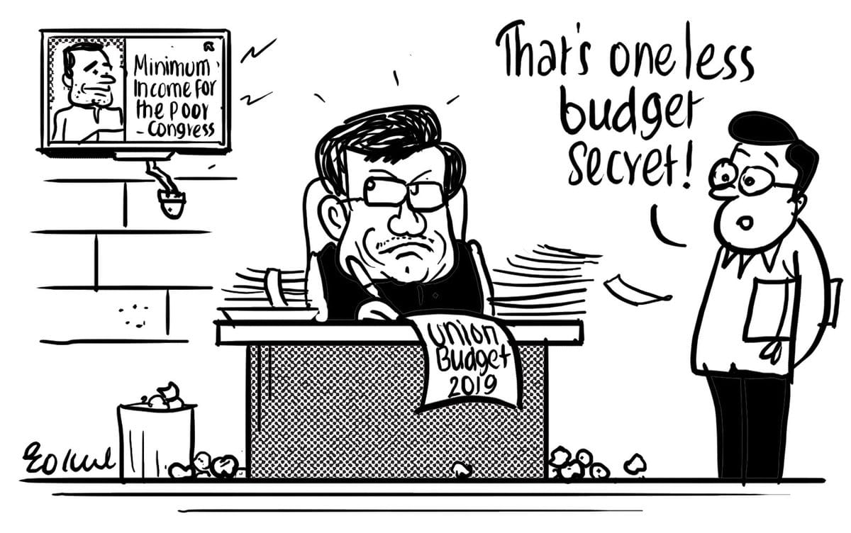 Gokul Gopalakrishnan for The Asian Age shows interim Finance Minister Piyush Goyal preparing the Union Budget 2019, with an eye on Rahul Gandhi’s promise of minimum income for the poor. The cartoonist feels Goyal will try to announce a sop to match it in the Budget, which means one less secret.