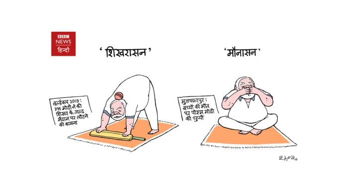 In today’s featured cartoon, Gopal Shunya takes a jibe at Prime Minister Narendra Modi’s silence on the death of more than 100 children amid a suspected encephalitis outbreak in Bihar’s Muzaffarpur, even as he tweeted for cricketer Shikhar Dhawan’s quick recovery from a recent injury.