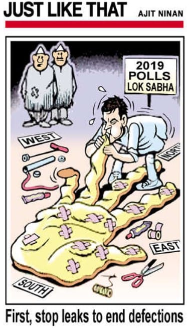 Ajit Ninan, for The Times of India, shows Congress President Rahul Gandhi trying to fix the ‘leaks’ in the Congress ‘hand balloon’. The cartoonist takes potshot at the Congress that is witnessing major defections ahead of the Lok Sabha elections.