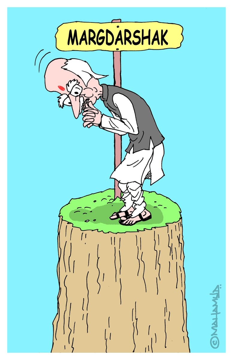 Mahamud illustrates ‘margdarshak’ Lal Krishna Advani in light of the BJP fielding party president Amit Shah from Gandhinagar in Gujarat. Advani had represented Gandhinagar six times in the past. He was made a member of the ‘margdarshak mandal’ (group of mentors) after the BJP came to power in 2014.