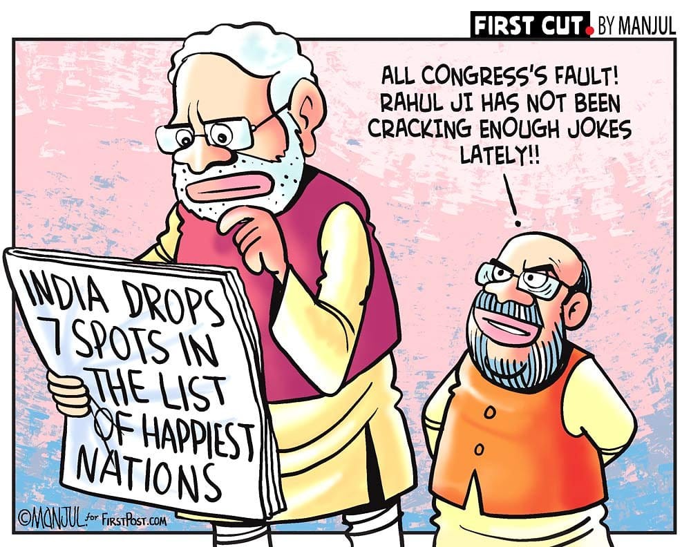 Manjul, for Firstpost, takes a dig at the India’s ranking on this year’s UN World Happiness Report. India figured at the 140th place, seven spots down from 133 last year. The cartoonist shows BJP president Amit Shah blaming Congress president Rahul Gandhi for the poor ranking.