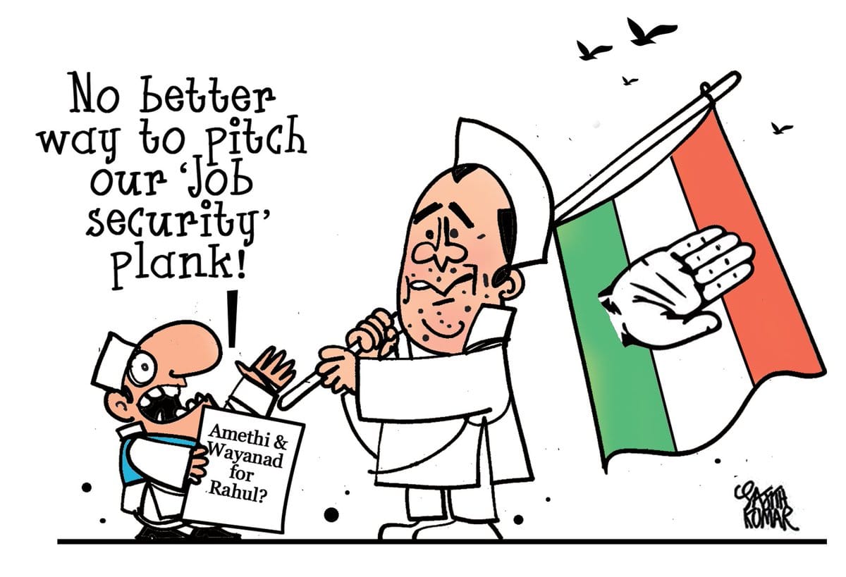 Sajith Kumar takes a potshot at Congress president Rahul Gandhi, who is likely to contest from Wayanad in Kerala apart from his current Lok Sabha constituency Amethi in Uttar Pradesh. The cartoonist calls it Congress’ ‘job security plan’.