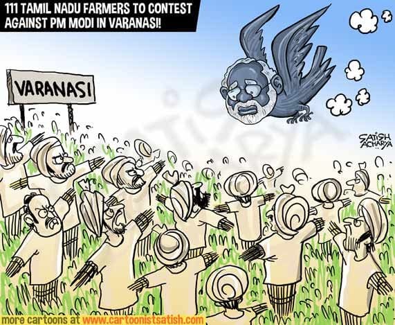 Satish Acharya shows the electoral face-off between 111 farmers from Tamil Nadu and Prime Minister Narendra Modi. The farmers will file 111 nominations from Modi’s Varanasi Lok Sabha constituency to contest against him. They said the decision to contest the polls from Uttar Pradesh was taken to urge the BJP to include in their manifesto their demands, including loan waivers and profitable prices for farm produce.
