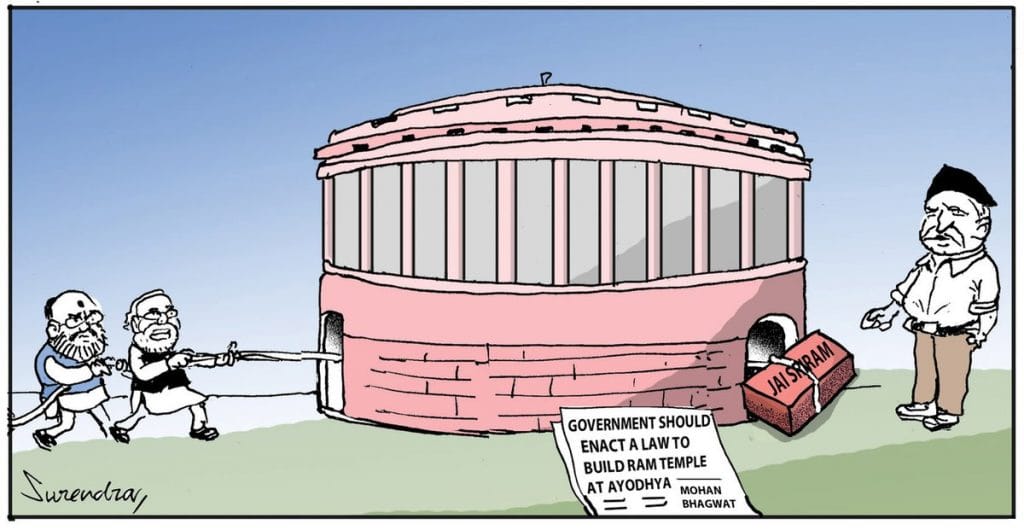 Surendra shows PM Narendra Modi and Amit Shah struggling to fulfill Mohan Bhagwat’s wish of building the Ram temple in Ayodhya, which he announced during his annual Vijay Dashami speech. The foundational brick won’t fit through Parliament.