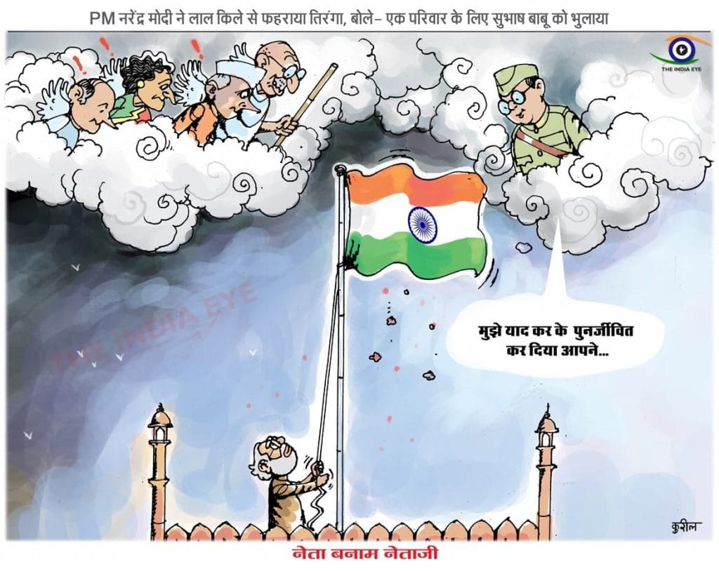 Manoj Kureel depicts PM Modi’s speech commemorating the 75th anniversary of the Azad Hind government led by Subhas Chandra Bose. The “one family” he criticised looks down with annoyance, while Bose ‘thanks’ Modi for rebirthing him.