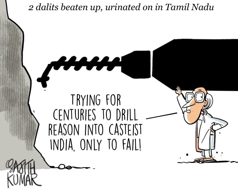 Sajith Kumar’s poignant cartoon draws parallels between casteism in India and the rescue operation to save labourers in Uttarakhand. He points out the recent incident in Tamil Nadu, where two Dalit youths were thrashed and urinated at when they asked for water.