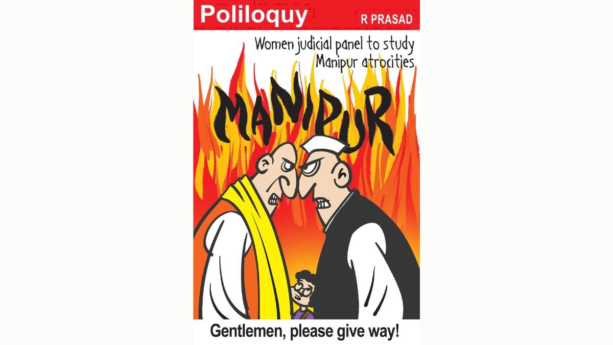 R Prasad’s cartoon alludes to the three-member women judicial committee constituted by the Supreme Court, comprising three former high court judges, to examine “relief, remedial measures, compensation, restoration of houses,” and other humanitarian issues for Manipur’s violence victims.