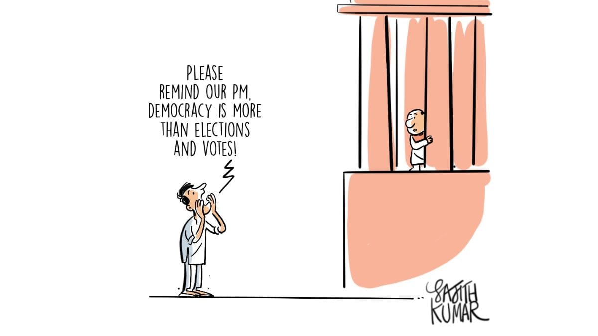 Sajith Kumar’s evocative cartoon captures the ongoing monsoon session’s ambiance and emphasizes that meaningful governance requires conversations between leaders and the public they represent and not just ‘electoral issues.’