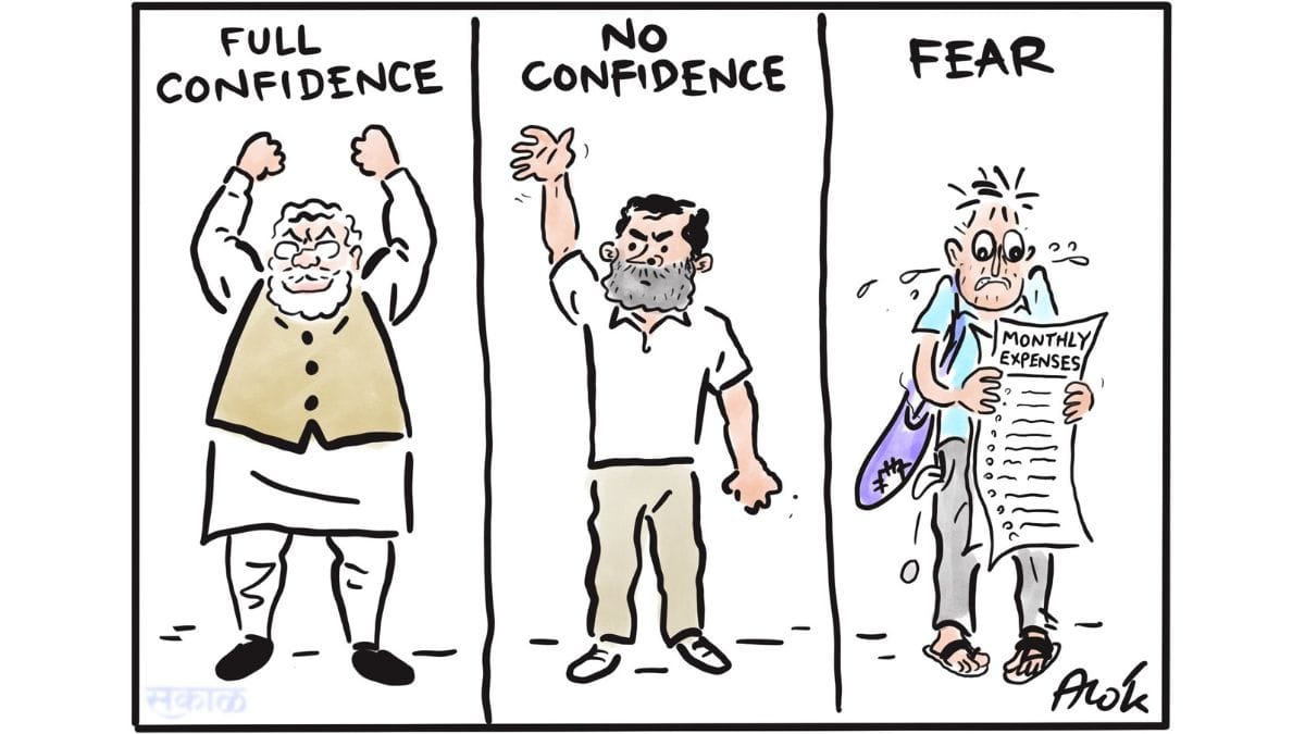 Alok Nirantar’s cartoon depicts three segments: Modi government’s ‘full confidence’, Rahul Gandhi‘s ‘no confidence’ in an ongoing motion, and a worried common man holding “monthly expenses” bills, symbolizing middle-class anxieties amid prevailing fear.