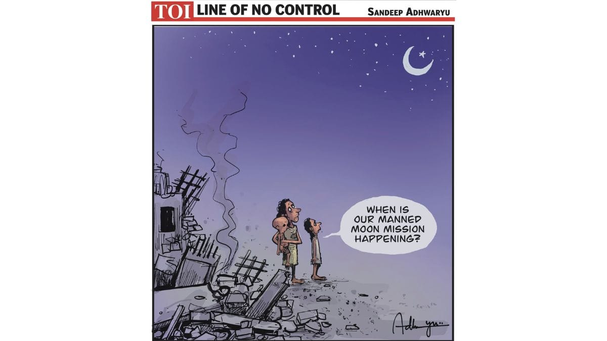 Sandeep Adhwaryu’s cartoon portrays displaced people after the Nuh bulldozing incident looking at the moon, hinting at their longing for attention amidst grander ambitions like a ‘manned moon mission.’