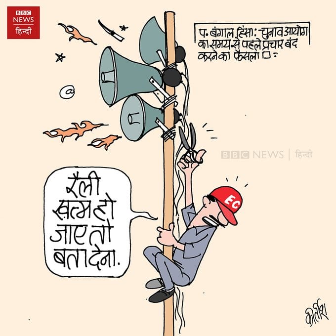Kirtish Bhatt takes a potshot at the Election Commission’s decision to invoke article 324 to bar all campaigning programs in West Bengal from Thursday. Bhatt illustrates an EC official waiting for all the rallies to end before he cuts off the power to the loudspeakers.