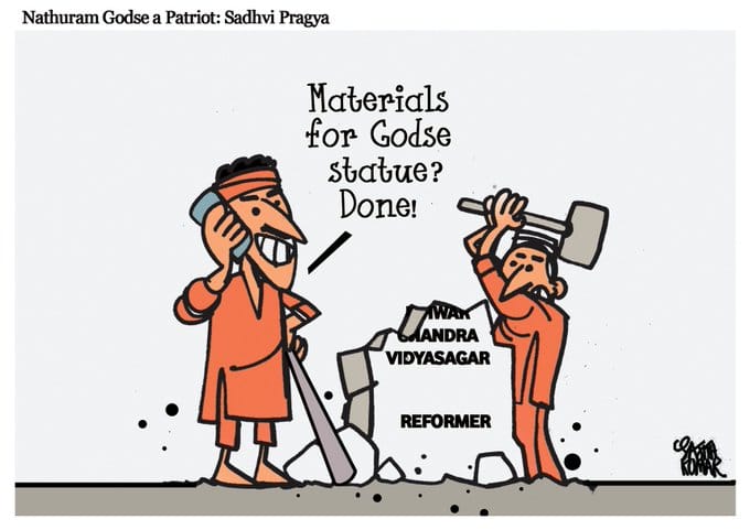 After controversial BJP leader Pragya Singh Thakur’s remarks on Mahatma Gandhi’s assassin Nathuram Godse, Sajith Kumar shows BJP workers collecting ‘materials’ for Godse’s statue by taking down statues of other leaders.