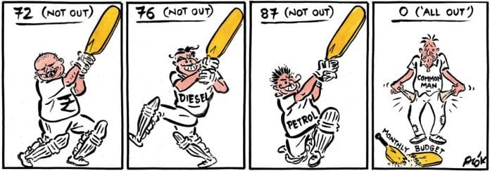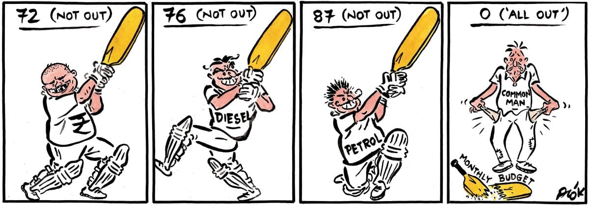Alok Nirantar illustrates how the common man is hit hard by the rising fuel prices.