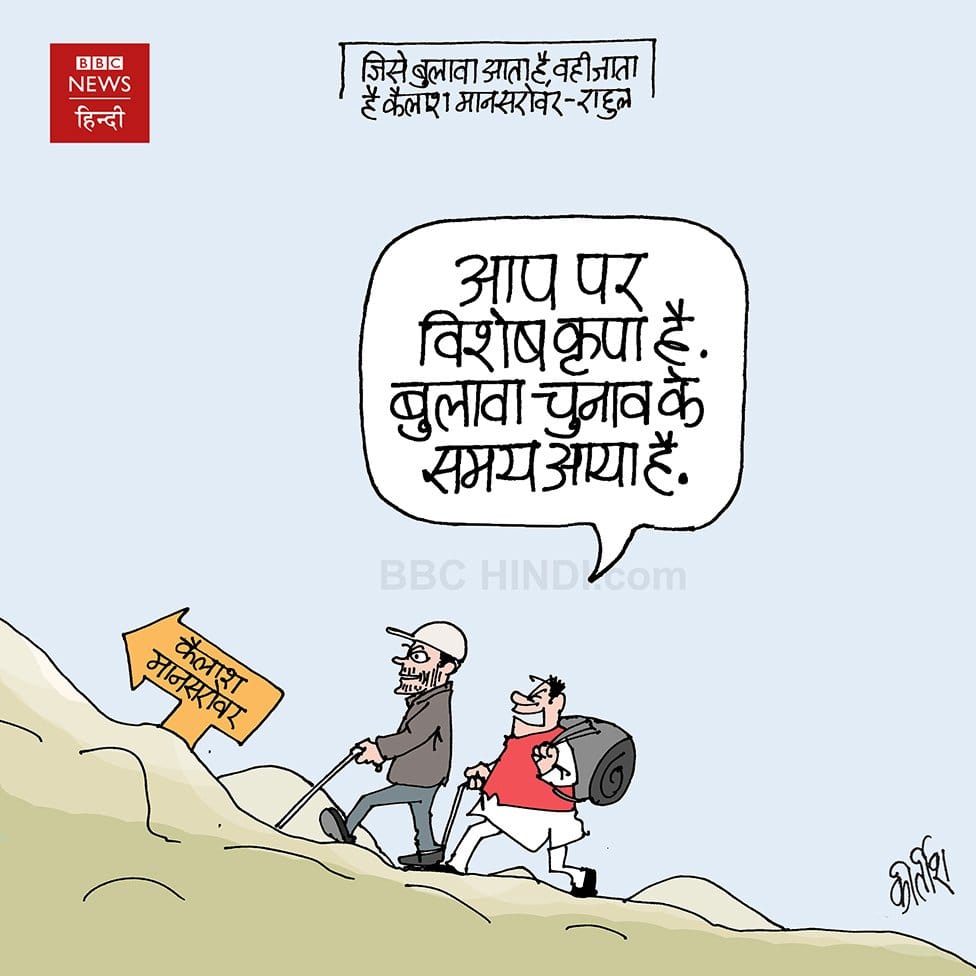 In BBC Hindi, cartoonist Kirtish Bhatt observes that Rahul Gandhi undertakes a journey to Kailash-Mansarovar at a time when assembly polls are round the corner,