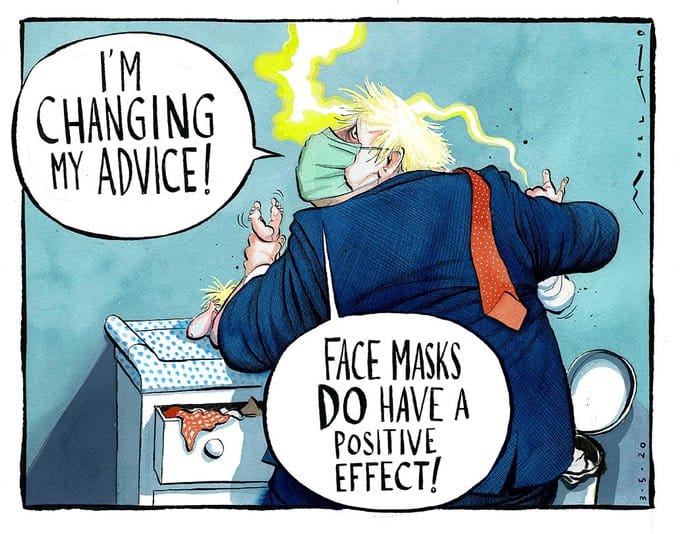 Morten Morland takes a jibe at Johnson’s comments on the usefulness of face masks — a U-turn from the UK government’s initial sceptical stance — in the context of his recently becoming a father to a baby named Wilfed Lawrie Nicholas after the doctors who saved his life from Covid-19.
