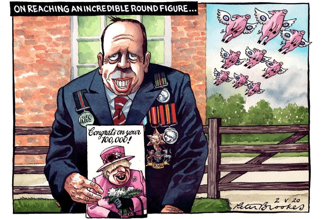 Peter Brookes scoffs at the announcement made by Matt Hancock, UK Secretary of State for Health and Social Care, that the Boris Johnson government has reached its target of 100,000 Covid tests per day. The cartoonist dresses up Johnson in the style of Queen Elizabeth II, whose birthday was celebrated last month, and depicts the old adage ‘when pigs fly’.