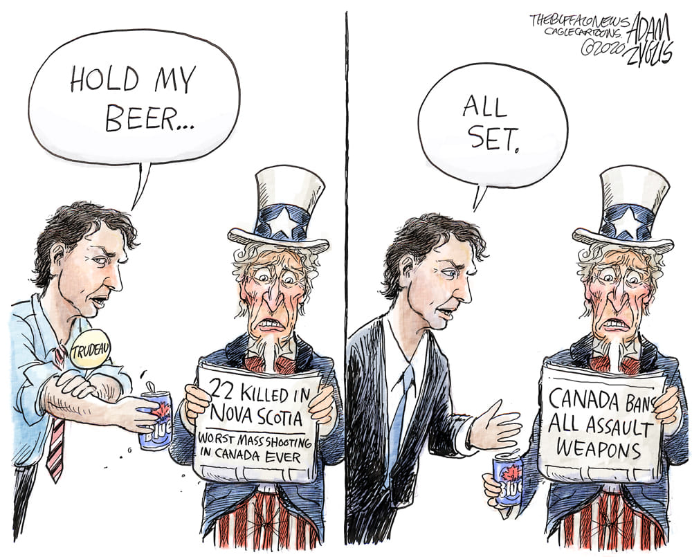 Adam Zyglis takes a swipe at US gun laws, in the context of Canada banning assault-style weapons following a gruesome mass shooting.