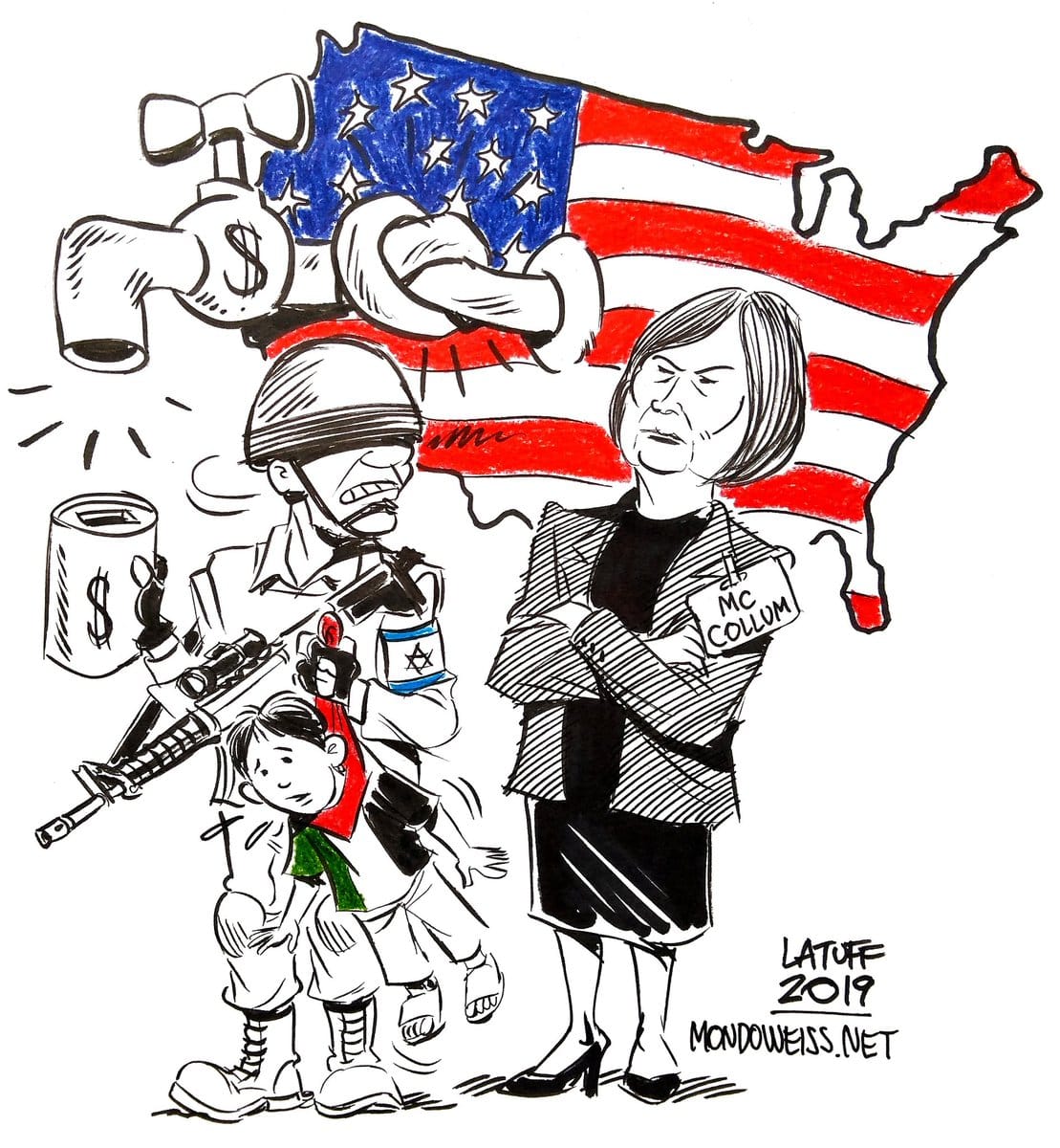 Carlos Latuff pays tribute to United States politician Betty McCollum for introducing a bill, which calls for her country to cut aid to Israel for arresting “Palestinian children.”