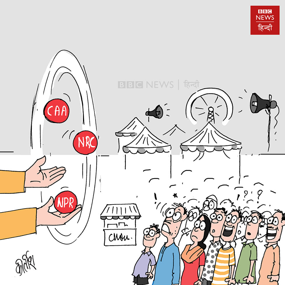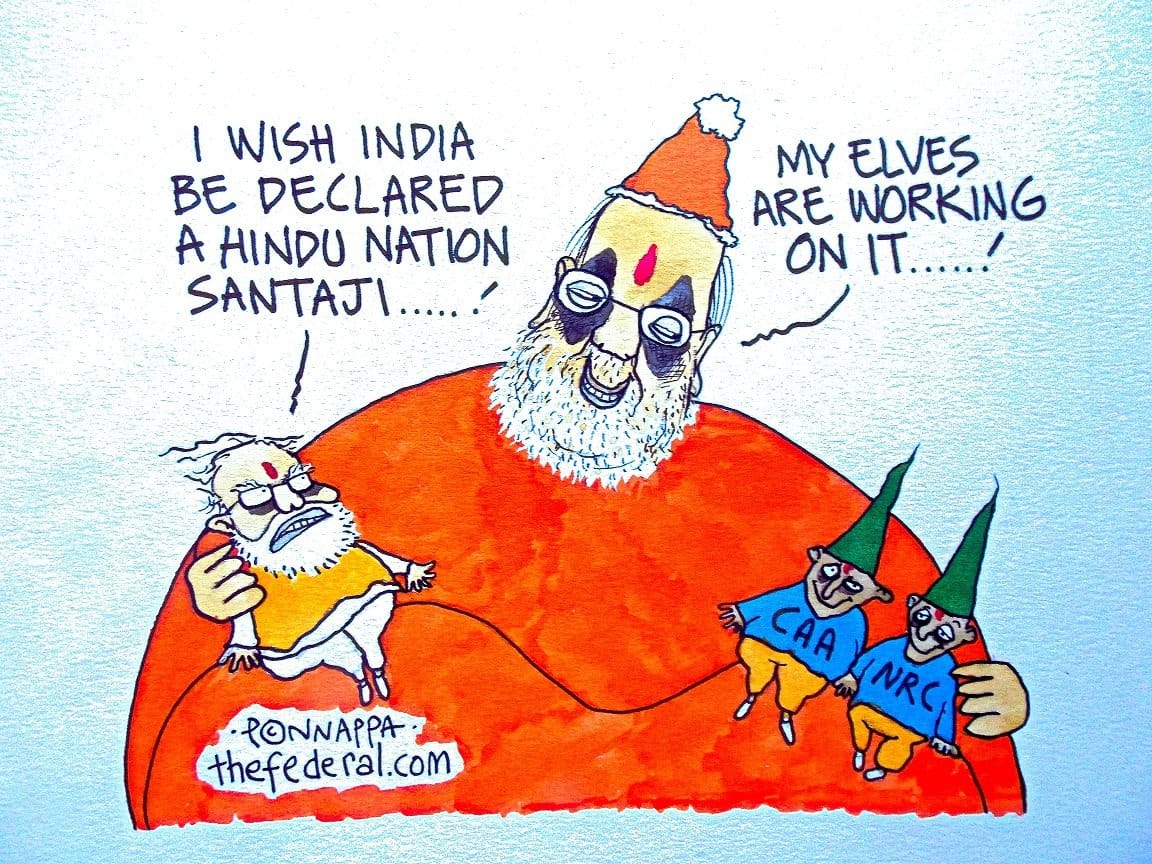 Nala Ponappa also weighs in on the CAA and the NRC, which, the cartoonist suggests, are ploys to change India into that of a Hindu Rashtra.