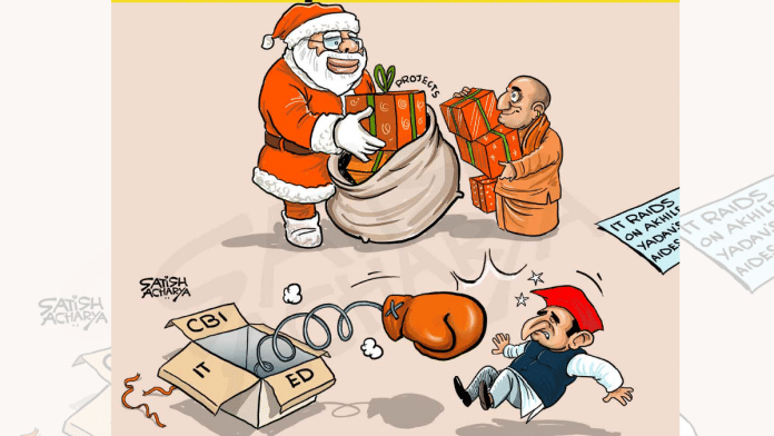 In today’s featured cartoon, Satish Acharya suggests that Christmas came early this year in poll-bound Uttar Pradesh, as he draws PM Narendra Modi as Santa Claus gifting development projects to CM Yogi Adityanath, while Samajwadi Party leader Akhilesh Yadav is punched in the nose by his gift. The allusion is to Income Tax raids at his aides’ houses in Lucknow.