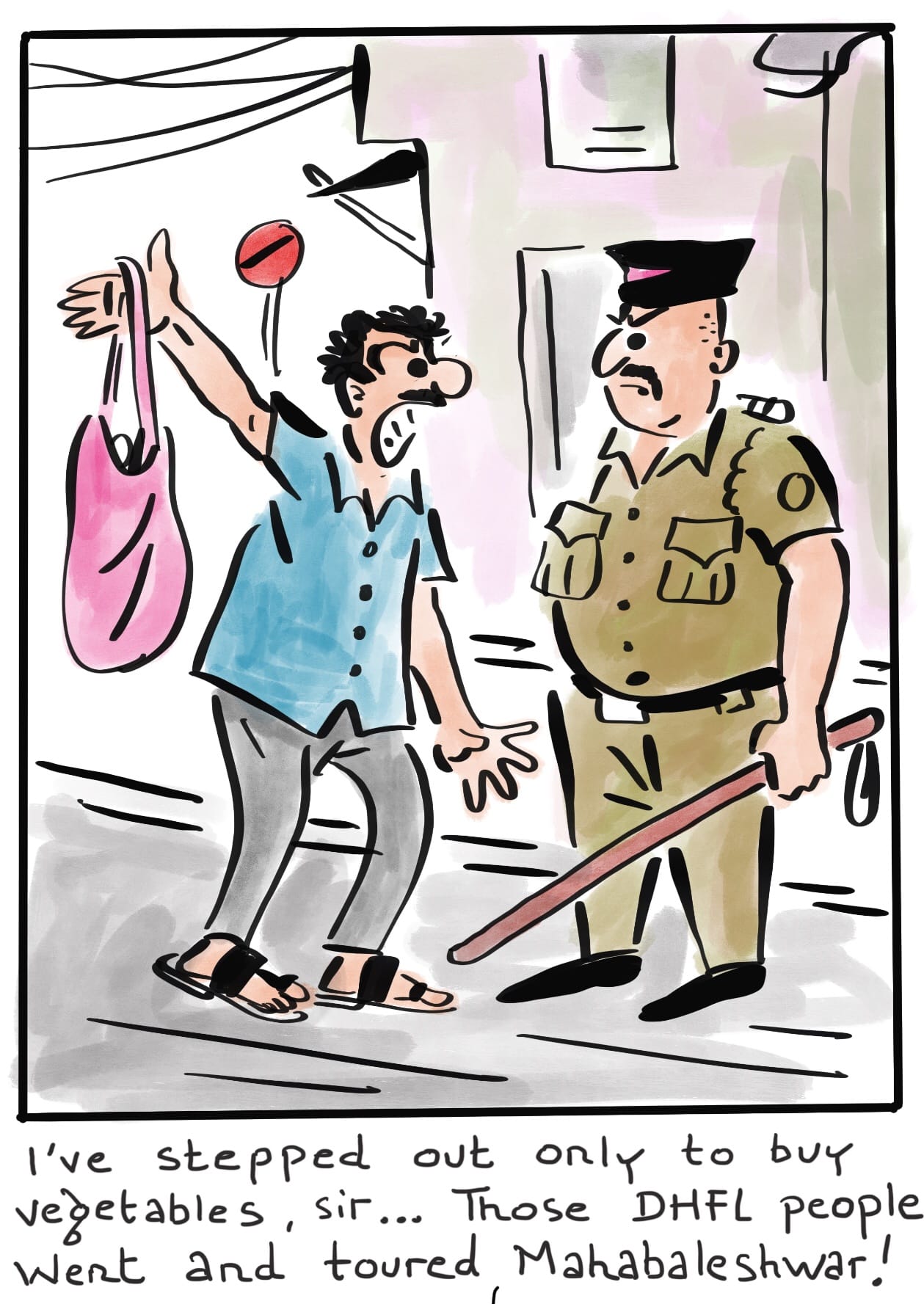 Alok Nirantar draws on the common man’s concerns under the lockdown. He spins the joke on Dheeraj and Kapil Wadhawan, billionaire promoters of the scam-hit Dewan Housing Finance Limited (DHFL), who were caught vacationing in Mahabaleshwar during the lockdown.